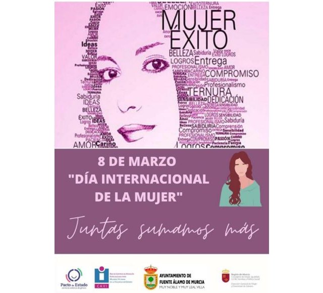 El Ayuntamiento de Fuente Álamo ha organizado una serie de actividades para conmemorar el Día Internacional de la Mujer, que comenzarán con un taller de risoterapia el 8 de marzo, para continuar con la lectura por la alcaldesa Juana María Martínez Gacía, del Manifiesto 8M 2021; "Mujeres líderes: Por un futuro igualitario en el mundo de la COVID-19". Una hora más tarde se inaugurará la I Exposición "Mujeres pioneras en la historia de Fuente Álamo", dirigida por la alcaldesa, en la Casa de Cultura de Fuente Álamo.