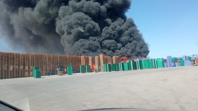 El incendio afecta a palets de plástico y cartón que se encuentran en el exterior de las naves, extendiéndose a los vehículos de la empresa estacionados en esa zona.
