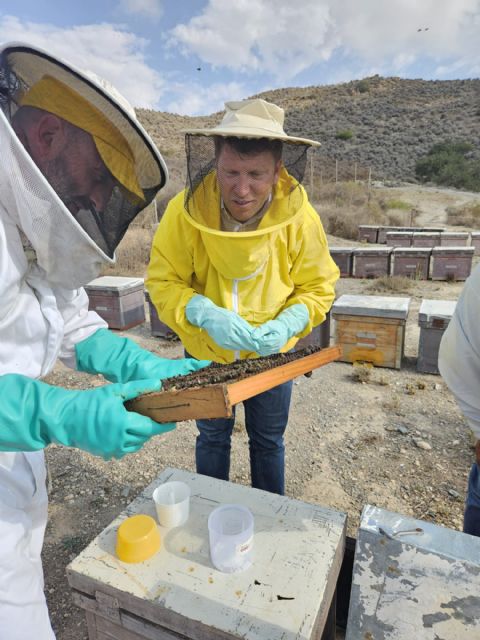 "Con esta convocatoria esperamos potenciar el trabajo que realizan los apicultores de la Región de Murcia", afirmó Juan Pedro durante en una visita a una colmena en Fuente Álamo, un asentamiento apícola dedicado a la polinización de cultivos como el melón.