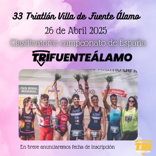 La 33º edición del Triatlón Internacional Villa de Fuente Álamo ya tiene fecha, se celebrará el sábado, 26 de abril de 2025. Un evento deportivo de gran tradición que ha atraído a atletas de todo el mundo a lo largo de los años.